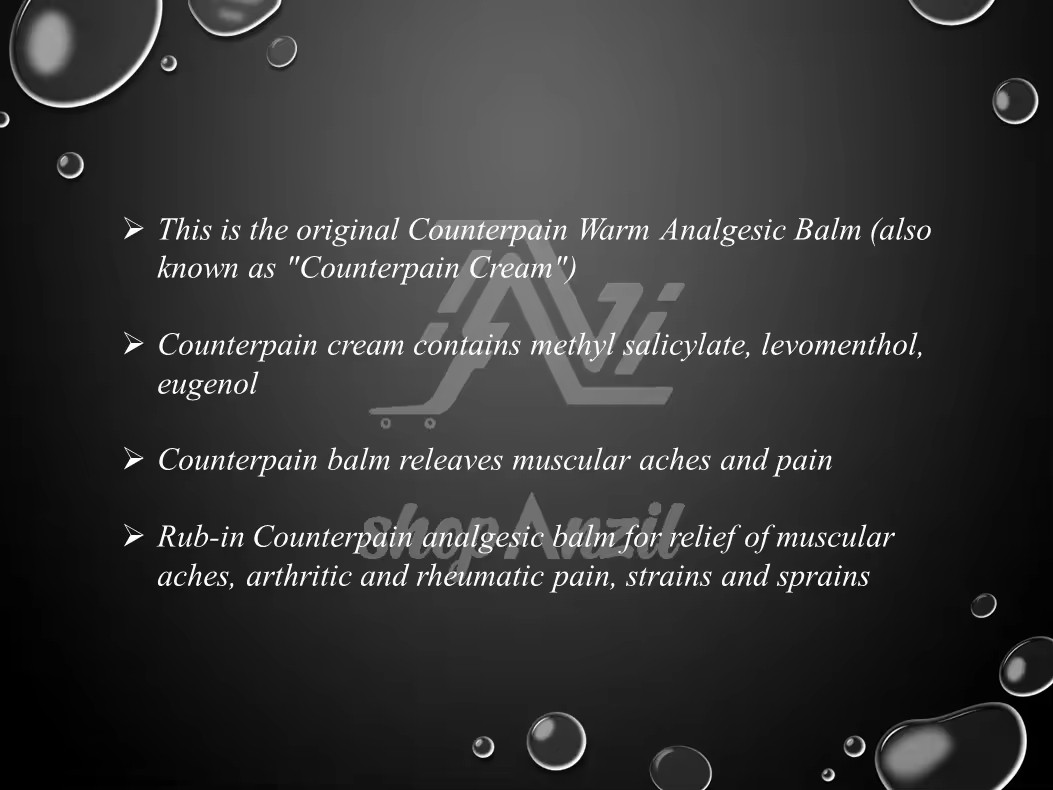 Apply Counterpain Analgesic Cream to the affected area. Feel the warmth of its ingredients helping to relieve muscle soreness and stiffness. Rub well on affected area. Repeat 3 - 4 times daily. For children under 2, consult a physician.